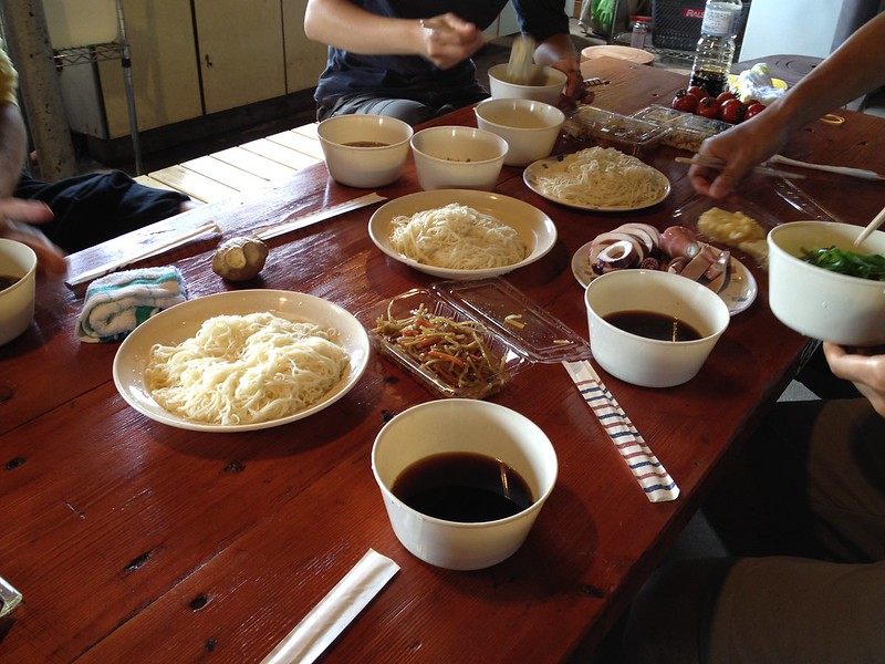 スーパーで買ったパンやらを食べる予定でいましたが、数日連泊している方々が作ったそうめんをいただきました。