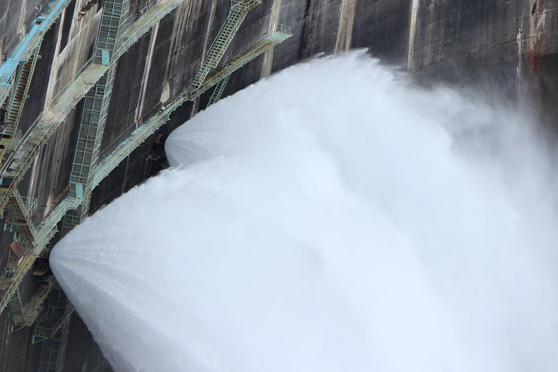 ここんところ雨が降っていないのでダムに水が少なく、1つ下の放出口から放出しているらしいです。
