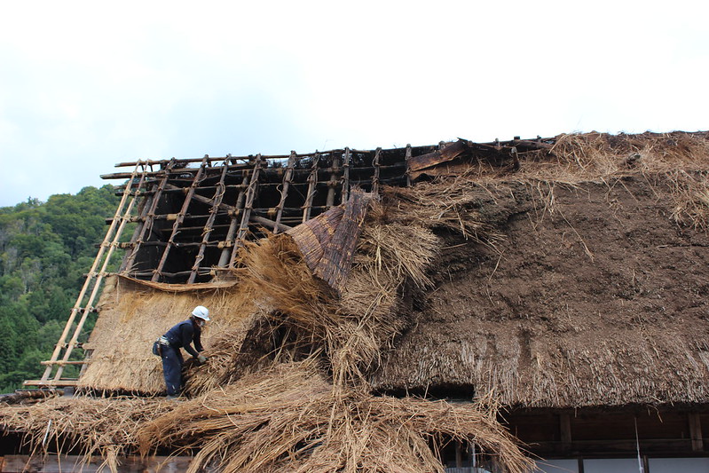 散策を終えて自転車に戻る途中、ちょうど屋根の葺き替えを行っていました。