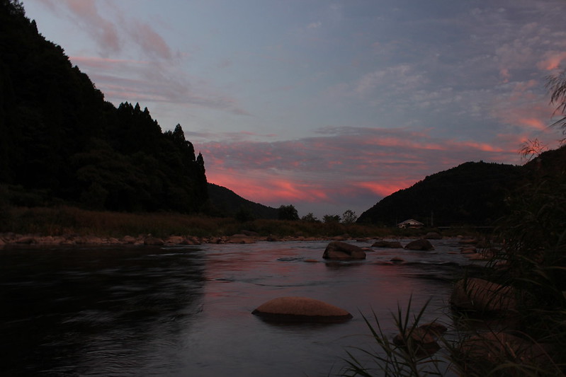 待っている間、道の駅脇の川辺から夕焼けをながめる。